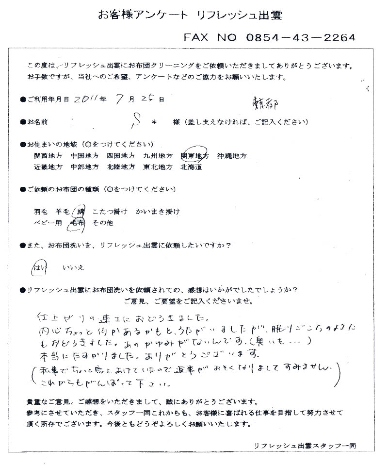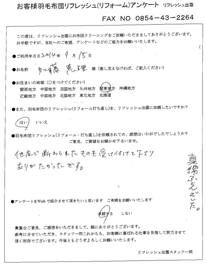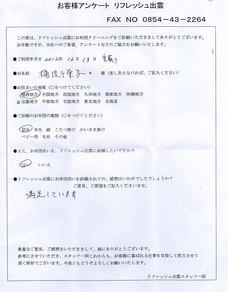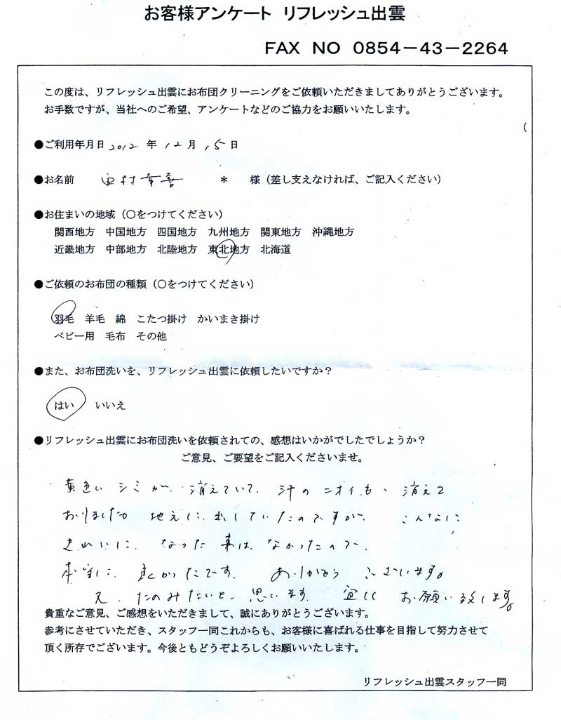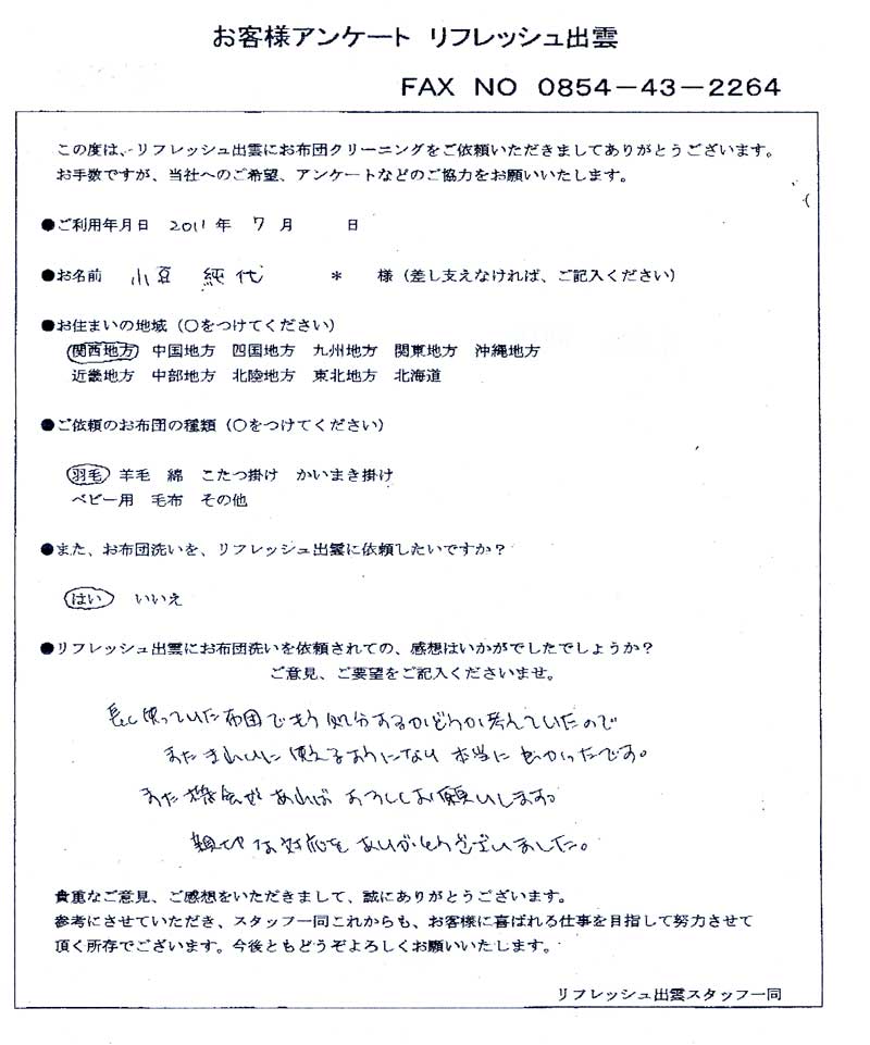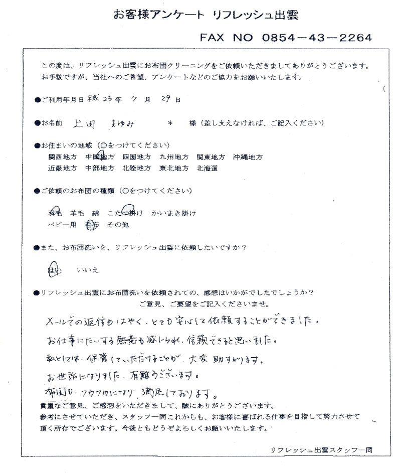 高級羽毛布団 ふとん丸洗いクリーニング専門 リフレッシュ出雲をご利用頂きまして、