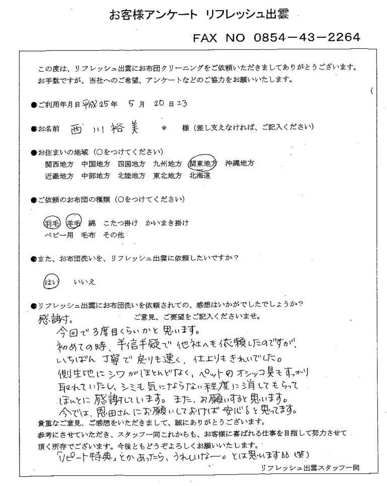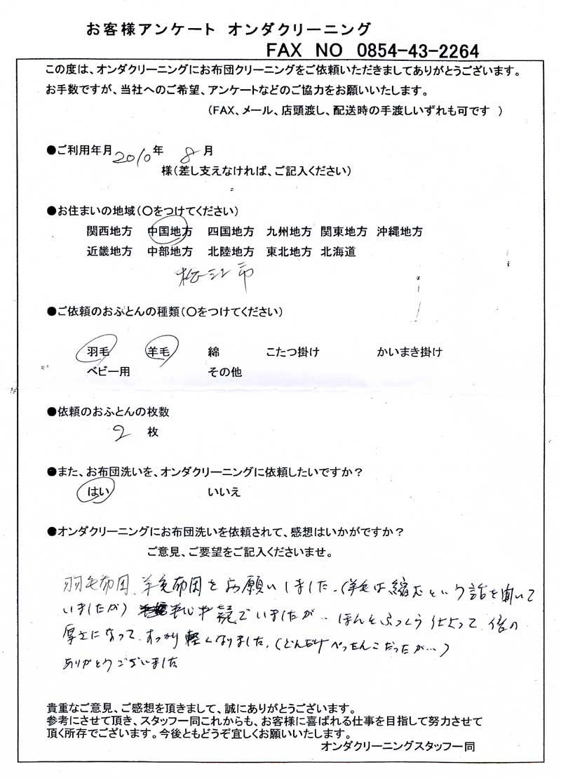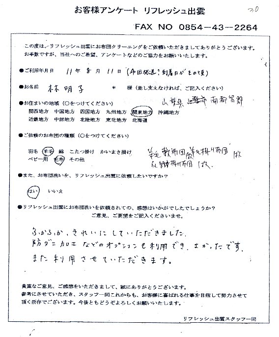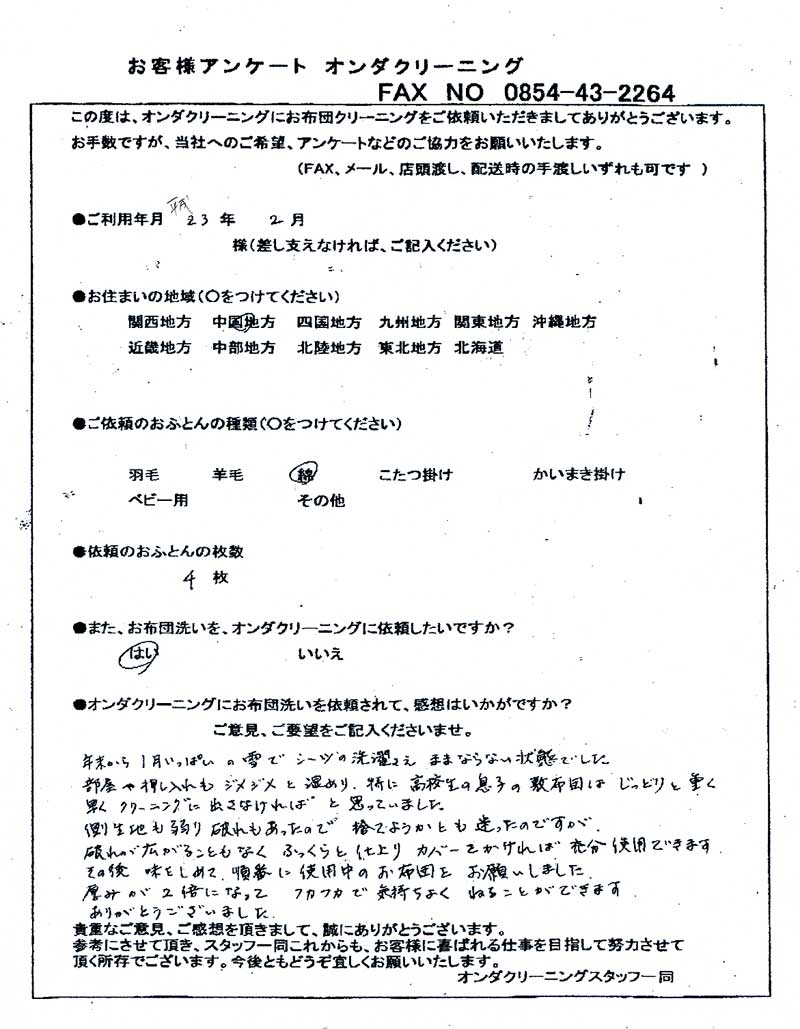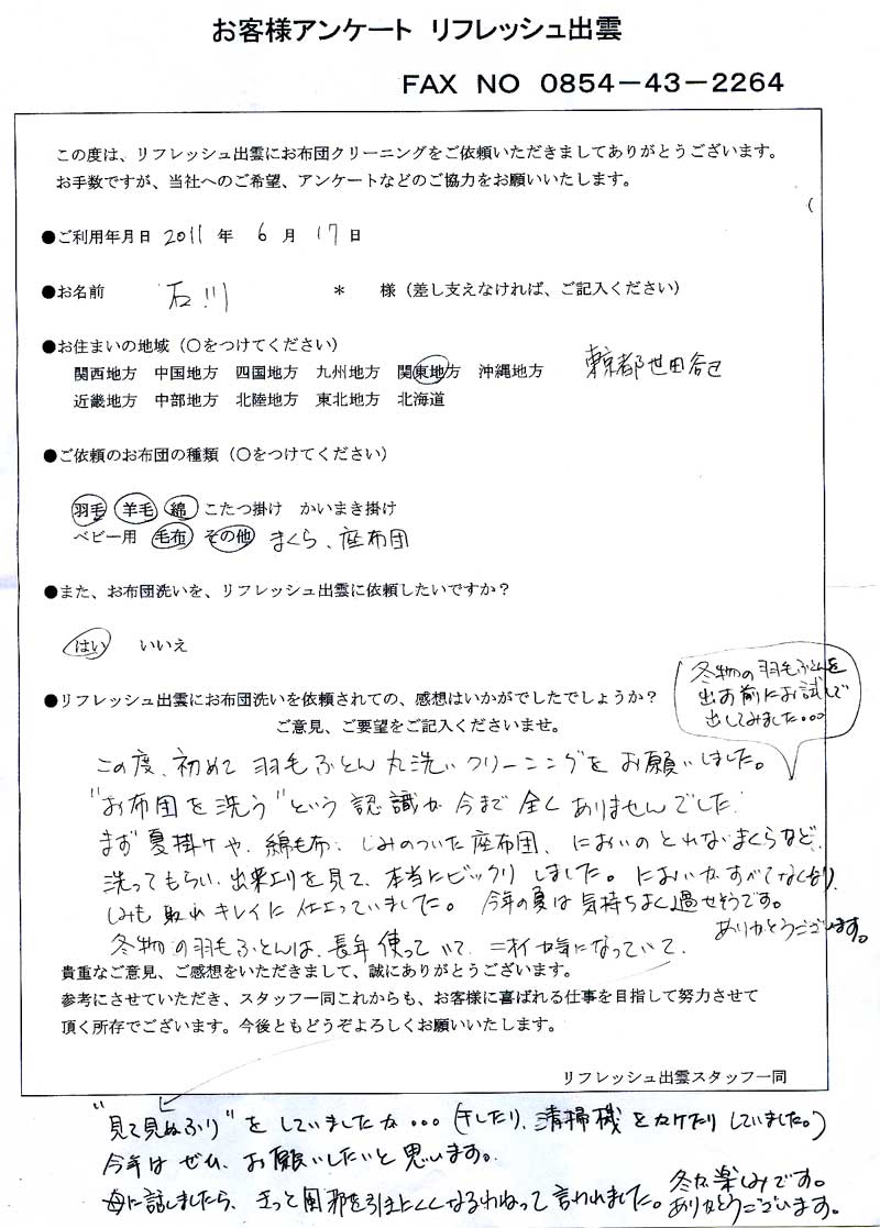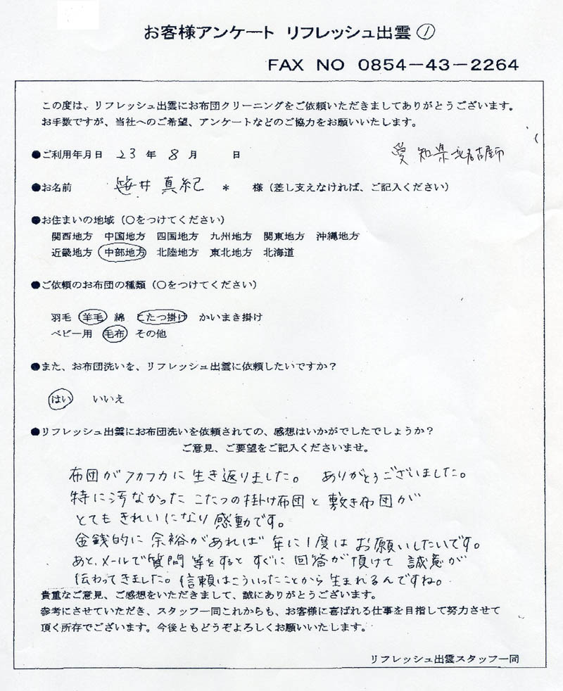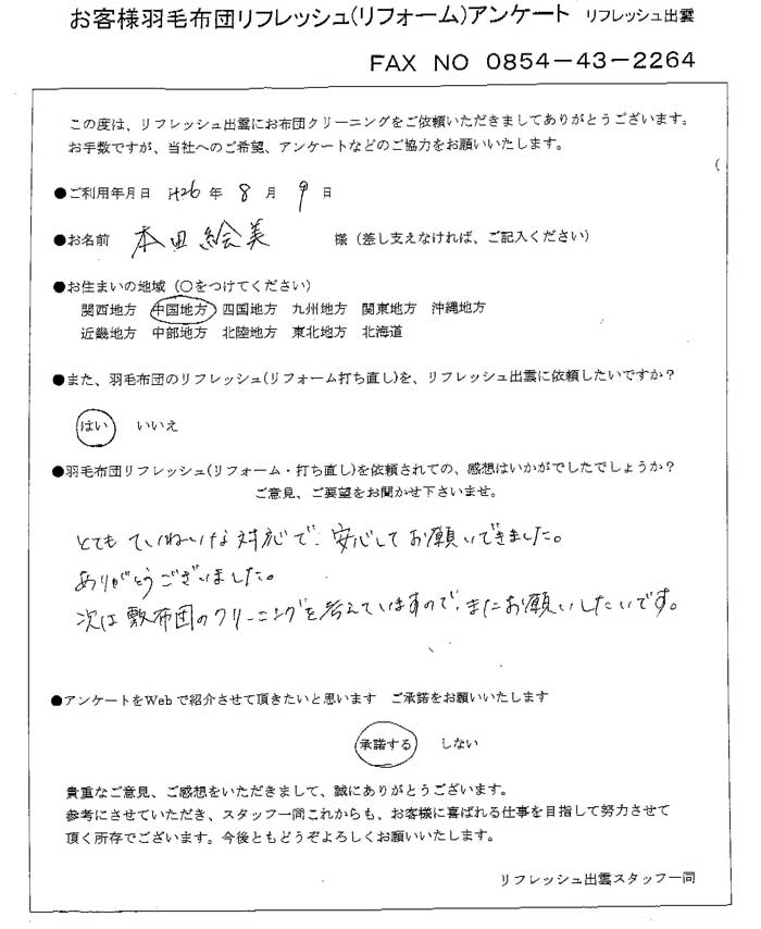 高級羽毛布団 ふとん丸洗いクリーニング専門 リフレッシュ出雲をご利用頂きまして、
