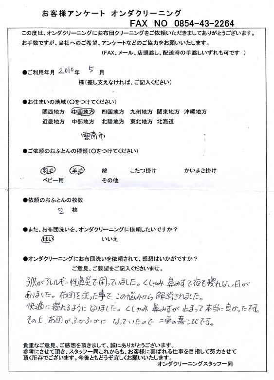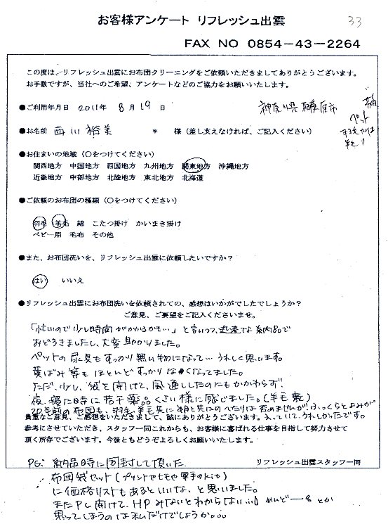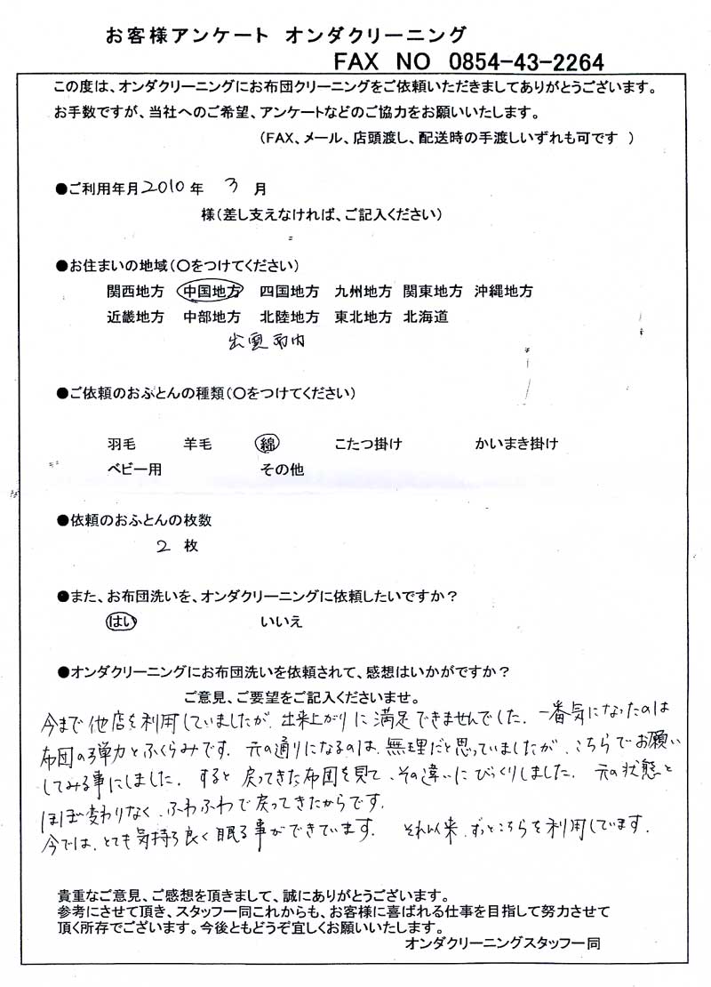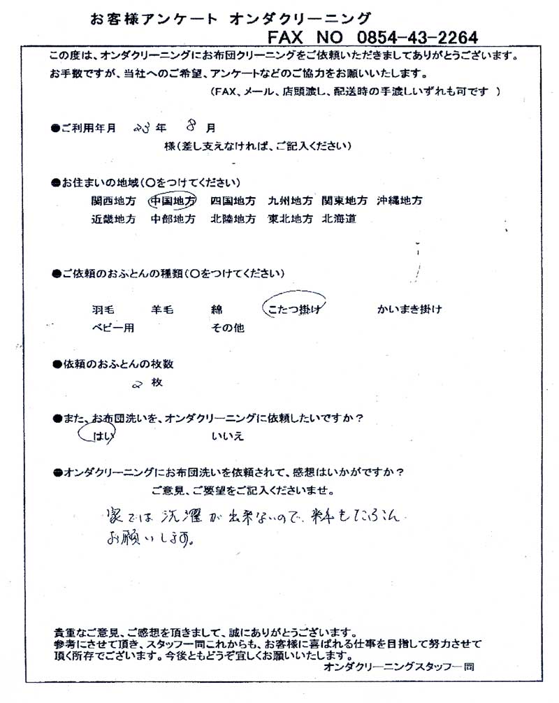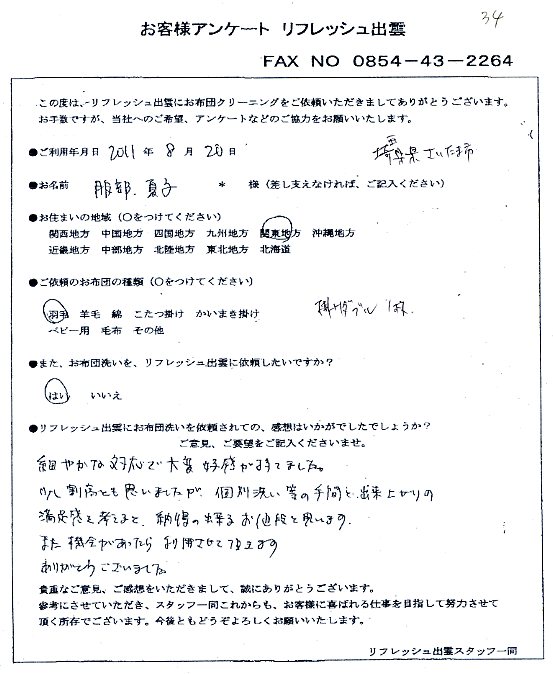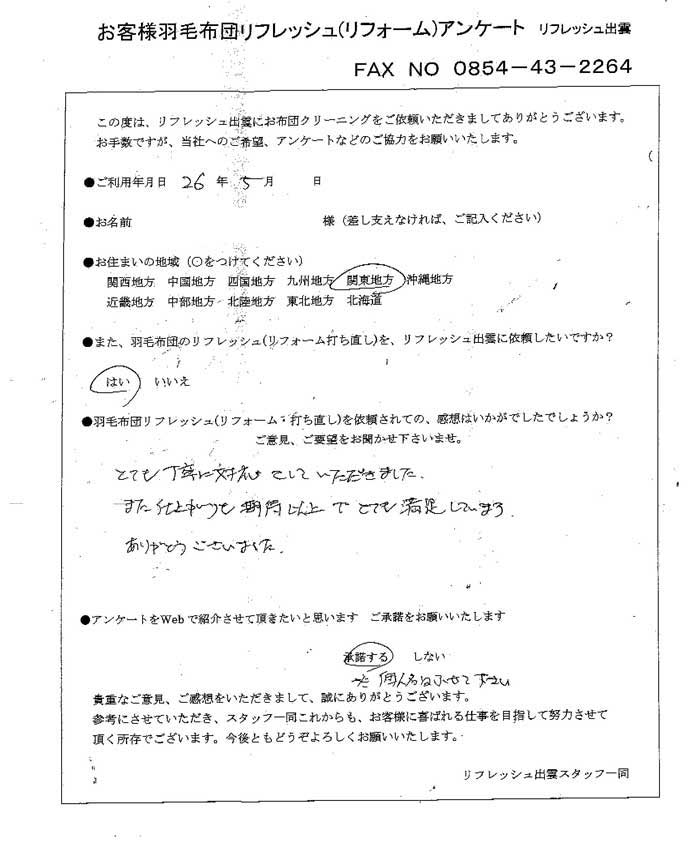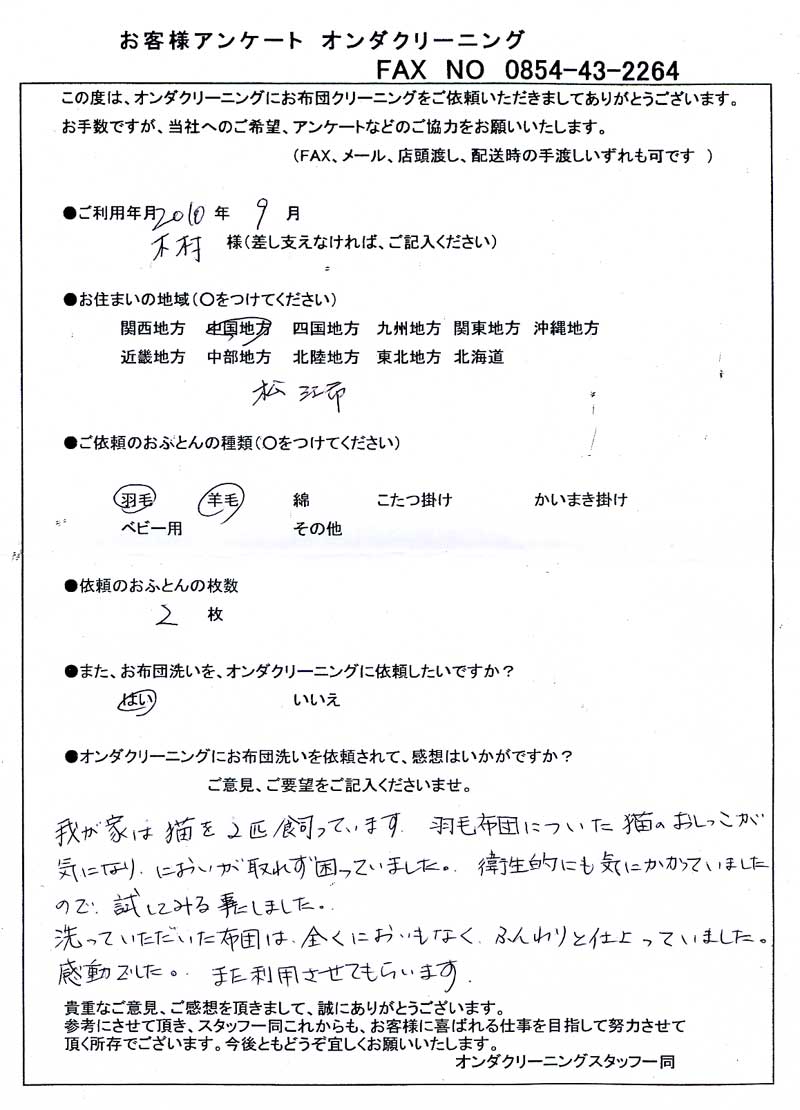 高級羽毛布団 ふとん丸洗いクリーニング専門 リフレッシュ出雲をご利用頂きまして、
