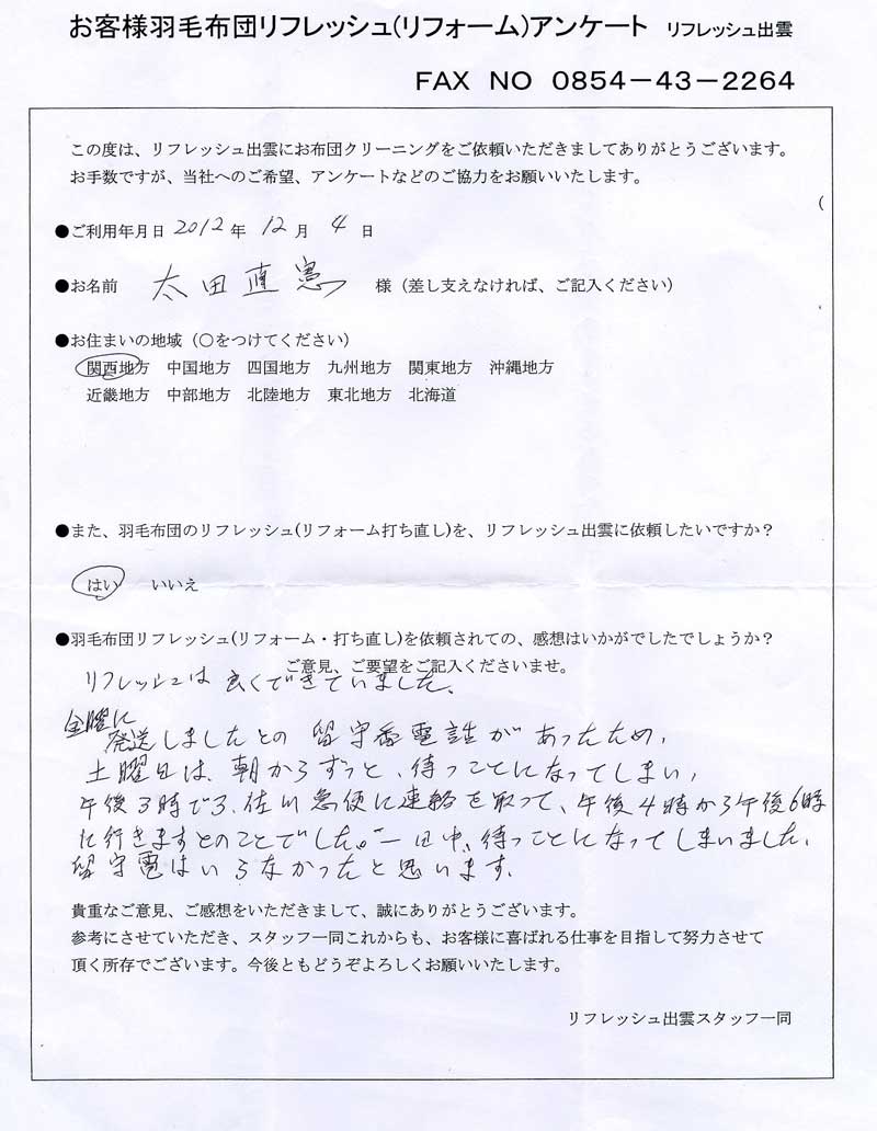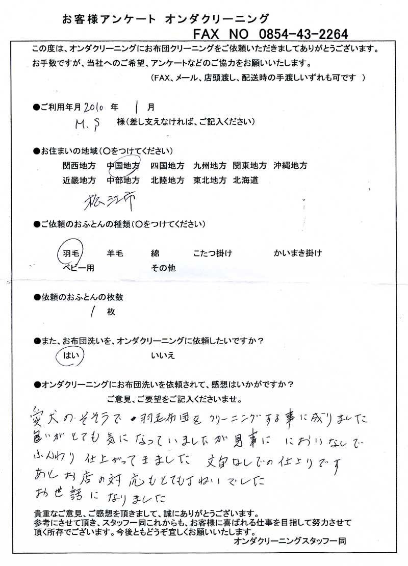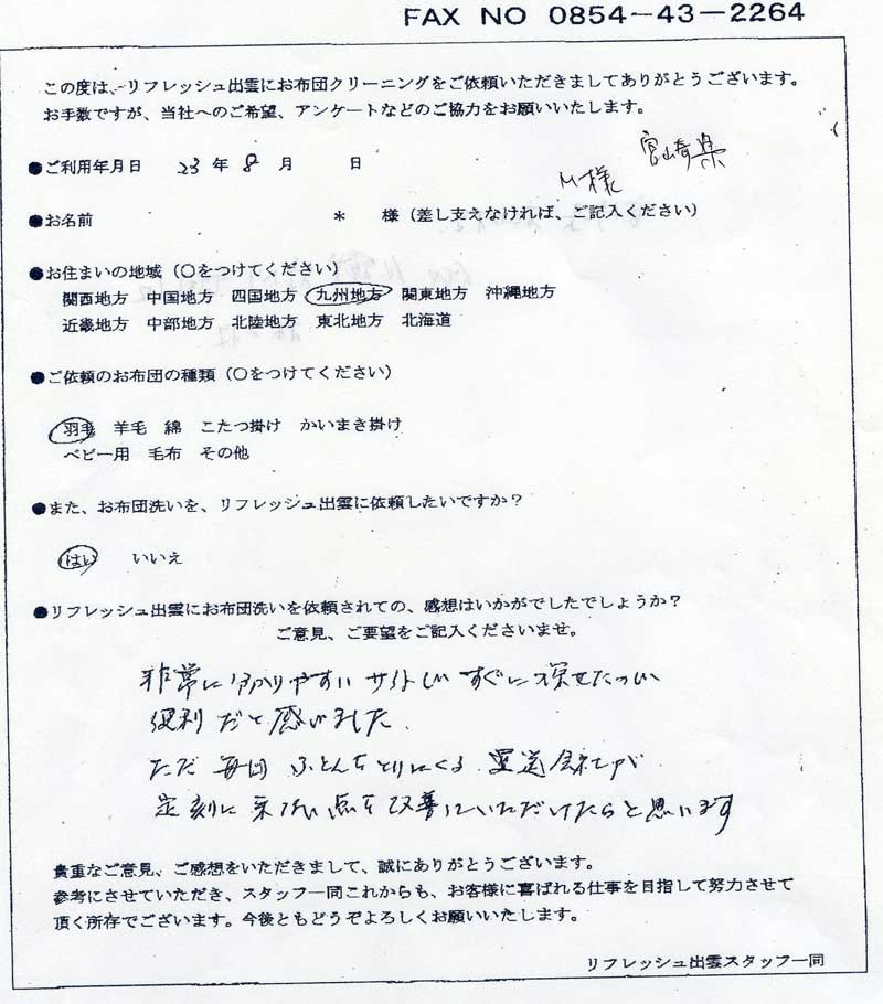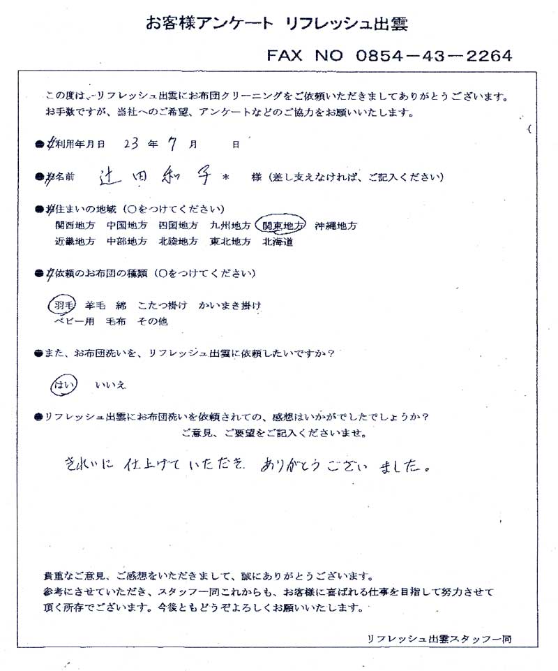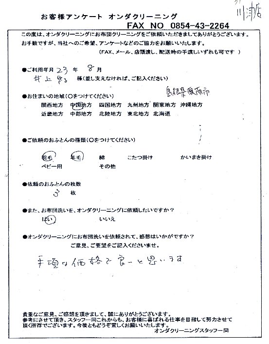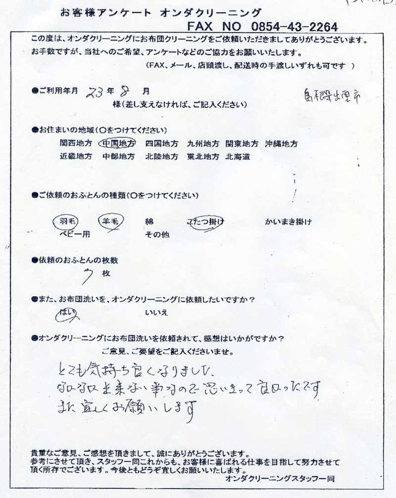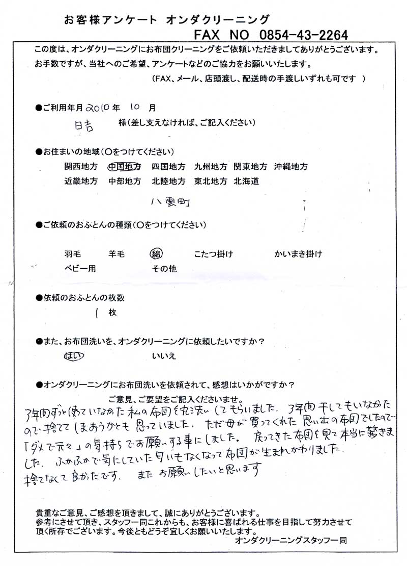 高級羽毛布団 ふとん丸洗いクリーニング専門 リフレッシュ出雲をご利用頂きまして、