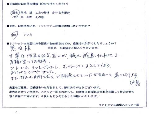 布団のリフォームをしていただき、有難うございます。仕上がりは大変