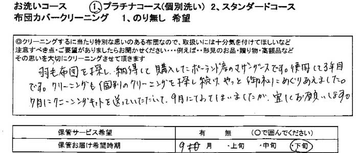 この度、初めて羽毛ふとん丸洗いクリーニングをお願いしました。