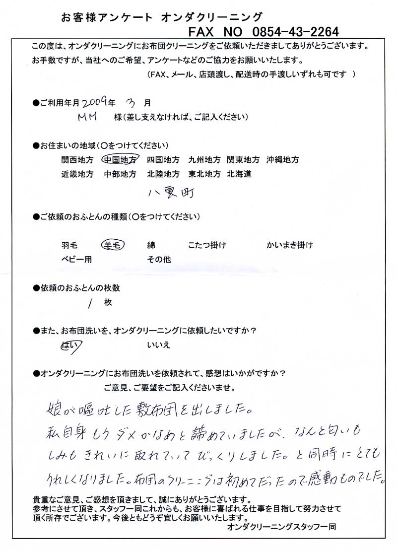 ありがとうございました。次は敷布団のクリーニングを考えています
