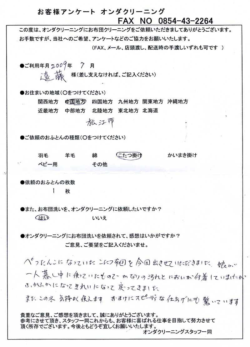 こたつ掛けふとんクリーニング1枚、お受けいたしました。ありがとうございます。