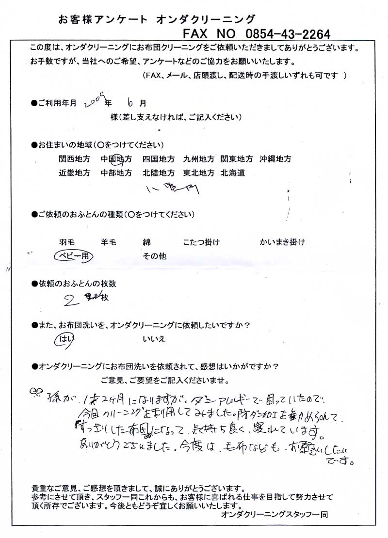 羽毛ベビー用ふとん丸洗いクリーニング 1枚お受けいたしました。ありがとうございます。 |